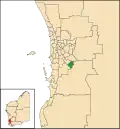 The 2007 redistribution, which took effect at the 2008 election, resulted in the seat losing eastern Kelmscott as well as Wungong and Forrestdale.[4] At the time Armadale was bounded by the Tonkin Highway to the northwest, the Canning River to the northeast, and the limits of the Armadale suburban area to the south and southeast. Its boundaries included the suburbs of Armadale, Brookdale, Champion Lakes, Hilbert, Mount Nasura, Mount Richon, Seville Grove and Camillo, as well as Kelmscott west of the Canning River.[5]