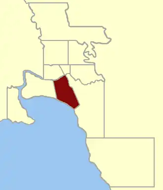 Commencing at the intersection of Pickles and Cowie streets ; thence south-easterly by Cowie-street to Bridport-street; east by Bridport-street to Cecil-street ; north by Cecil-street to the St. Kilda Railway ; further north crossing the St. Kilda and Sandridge Railways and by Cecil-street extension to the Normanby-road ; easterly crossing that road to White-street ; north-westerly by White-street to the River Yarra ; down that river to a point opposite the south-west angle of the City of Melbourne; thence to and by Boundary-street to Pickles-street ; by Pickles-street to the commencing point.[4]