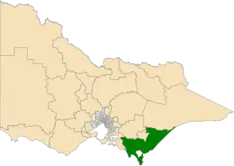 The electoral district of Gippsland South (initially known as South Gippsland)[1] is a Lower House electoral district of the Victorian Parliament.[2] It is located within the Eastern Victoria Region of the Legislative Council.