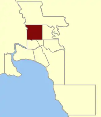 The Electoral District of North Melbourne was defined as being bound by Victoria Street/Parade on the south, Nicholson Street on the east, the southern boundary of portion 90, parish of Jika Jika on the north and a line south from Mains Bridge (now Flemington Bridge)[3] to the Victoria Street alignment by the 1858 Electoral Districts Act.[2] This included the suburbs of Carlton, Parkville and North Melbourne.