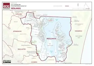 Redlands is an electoral district of the Legislative Assembly in the Australian state of Queensland. It primarily covers coastal suburbs on the southside of the city of Brisbane, from Thornlands south to the Logan River.[1]