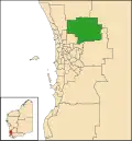Based in the north-east corner of Perth's Metropolitan Region Scheme, Swan Hills covers large parts of the Swan Valley and Darling Scarp. The district takes in the communities of Aveley, Bailup, Belhus, Brigadoon, Bullsbrook, Chidlow, Ellenbrook, Gidgegannup, Melaleuca, Mount Helena, Sawyers Valley, The Vines, Upper Swan and Wooroloo.[1]