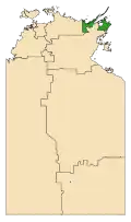 Mulka is an electoral division of the Northern Territory Legislative Assembly in Australia. It was created in a 2019 redistribution for the 2020 general election, replacing the electoral division of Nhulunbuy.[1] At that election, independent Nhulunbuy incumbent Yingiya Mark Guyula won the seat in a tightly contested rematch of the 2016 general election, with the Territory Labor Party being his only opposition.