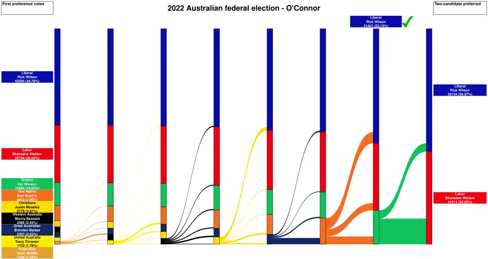 Alluvial diagram for preference flows in the seat of O'Connor in the 2022 federal election. checkY indicates at what stage the winning candidate had over 50% of the votes and was declared the winner.