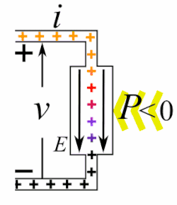 • Active devices (power sources): if conventional electric current (positive charge) is forced to flow through the device in the direction from the lower electric potential to the higher, against the opposing force of the electric field (E) between the terminals (this is equivalent to the negatively charged electrons moving from the positive terminal to the negative terminal) work will be done on the charges. So energy is being converted to electric potential energy from some other type of energy, such as mechanical energy or chemical energy. Devices in which this occurs are called active devices or power sources; such as electric generators and batteries.