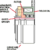 When the clutch is actuated, current flows through the electromagnet producing a magnetic field. The rotor portion of the clutch becomes magnetized and sets up a magnetic loop that attracts the armature. The armature is pulled against the rotor and a frictional force is generated at contact. Within a relatively short time, the load is accelerated to match the speed of the rotor, thereby engaging the armature and the output hub of the clutch. In most instances, the rotor is constantly rotating with the input all the time.