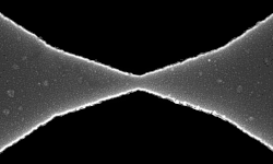 Electromigrated nanogaps are gaps formed in metallic bridges formed by the process of electromigration. A nanosized contact formed by electromigration acts like a waveguide for electrons. The nanocontact essentially acts like a one-dimensional wire with a conductance of . The current in a wire is the velocity of the electrons multiplied by the charge and number per unit length, or . This gives a conductance of . In nanoscale bridges the conductance falls in discrete steps of multiples of the quantum conductance .