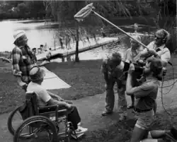 On location outside Baltimore, cameraman Jim Furrer, sound recordist Bill Porter, and director David Ryan interview participants in a public rowing clinic as part of an early electronic journalism shoot in the 1980s.