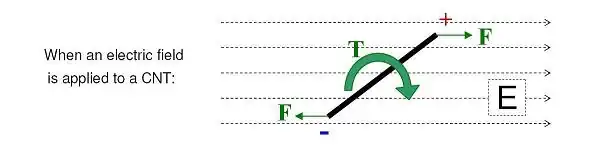 In case of a cantilevered CNT, it would be bent to the field direction. Meanwhile the electrically induced torque and stiffness of the CNT compete against each other. This deformation has been observed in experiments.[1][2] This property is an important characteristic for CNTs promising nanoelectromechanical systems applications, as well as for their fabrication, separation and electromanipulation. Recently, several nanoelectromechanical systems based on cantilevered CNTs have been reported such as: nanorelays, nanoswitches, nanotweezers and feedback device which are designed for memory, sensing or actuation uses. Furthermore, theoretical studies have been carried out to try to get a full understanding of the electric deflection of carbon nanotubes,[3]