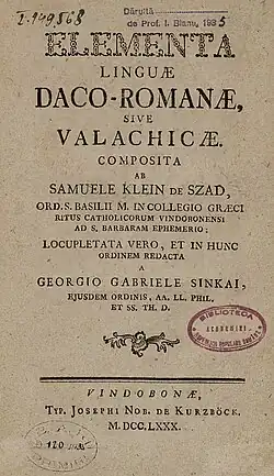 Elementa linguae daco-romanae sive valachicae ("Elements of the Daco-Roman or Vlach/Wallachian language") is a Romanian grammar book written by Samuil Micu-Klein and revised by Gheorghe Șincai in 1780 at the Saint Barbara College in Vienna. It was printed by Joseph Typography, owned by the nobleman of Kurzböck, in the same year. The book, and subsequently the year, are considered the starting point of the Romanian language's modern form.[1]