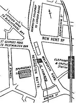 In the 19th century the nationally famed Baptist preacher Charles Haddon Spurgeon built the Metropolitan Tabernacle here.[12] The building, designed by William Willmer Pocock,[12] was finished in 1861 and dedicated on 18 March. It was bombed in the bombing of London but the portico and basement survived. In 1957 the tabernacle was rebuilt to a new, much smaller design, accommodating surviving original features.