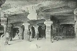 The main cave, also called Cave 1, Grand Cave or the Great Cave, is 39.63 metres (130.0 ft) square in plan with a hall (mandapa).[12] The basic plan of the cave can be traced back to the plan of the ancient Buddhist viharas, consisting of a square court surrounded by cells, built from about 500 to 600 years before in India.[24] The Cave has several entrances, the main entrance is unassumingly small and hides the grand hall inside. The main entrance faces north, while two side entrances face east and west. The cave's main entrance is aligned with the north–south axis, unusual for a Shiva shrine (normally east–west).[10][21][2] However, inside is an integrated square plan Linga shrine (garbha-griya) that is aligned east–west, opening to the sunrise.[12]