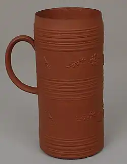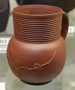 The Elers brothers came to England in the 1680s. After moving to London, David was still recorded working as a silversmith in London in 1686.[4] By about 1690, the brothers were in business in Fulham, making stoneware.[5] They discovered a fine red clay at Bradwell in Staffordshire, which was very suitable for producing redware in imitation of Yixing ware, the Chinese red pottery, which the East India companies imported into England. According to one Chinese scholar it was "even finer than the clay used at Yixing".[6]