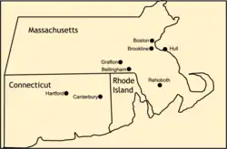 Most likely, at the urging of Elder Alden, Winchester moved to the nearby town of Grafton. Elder Noah Alden had been involved in organizing the Grafton church in 1767. Winchester preached at Grafton but did not serve as its minister.[14] He spent the next two years preaching in the neighboring towns of Northridge and Upton. He even spent some time preaching in Hull, located on a peninsular point in Boston Harbor.