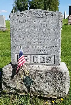 Briggs was honorably discharged at the end of the war and returned to Lime Rock before relocating to Beacon, New York. On June 24, 1874, he married H. Elizabeth Montfort with whom he had one daughter. Briggs was a member of the Grand Army of the Republic, Independent Order of Odd Fellows and the local Methodist Episcopal Church.[1] He died on March 10, 1922, and his remains are interred at Fishkill Rural Cemetery in Fishkill, New York.[2][3][5]