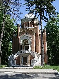 Brătianu died on 13 May 1957 and was buried in the Rosetti Family Tomb in the Bellu Cemetery.[3] In 1991, after the Romanian Revolution had overturned the communist regime, the statue of Ion I. C. Brătianu was located and restored to its original location.[18] Marian Stefan collected the memoirs of Elisa and Ion Brătianu and published them in Magazin Istoric in 1992 and 1997. In 1999, these were published by Editura Oscar Print as Elisa Brătianu, Ion IC Brătianu, Memorii involuntare (Elisa Brătianu, Ion IC Brătianu, Involuntary Memories).[10] In 2015, the Art History Publishing House, released volume two of its series Carte de nu-mă-uita (Do Not Forget Me), Memoriile prințesei Elisa Știrbey Brătianu (Memoirs of Princess Elisa Știrbey Brătianu) to mark her 145th birthday.[20]