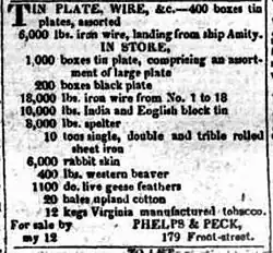 Peck's association with Anson G. Phelps laid the foundation for the creation of Phelps, Dodge & Co., a business that became the dominant importers of metals into America, and the dominant exporters of tin-plate from Britain for half a century. The company eventually became one of the largest copper mining and copper producing concerns in the world.[19]