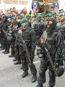 The Elite Forces of Malaysia (Malay: Pasukan Elit Malaysia) are specialised, highly trained units drawn from various branches of the Malaysian military, law enforcement, and government agencies. In Malaysia, the term Elite Forces serves as an umbrella term encompassing special forces, special operations units, specialised firefighting teams, and other uniquely trained groups within the uniformed services (Pasukan beruniform).[1][2][3]