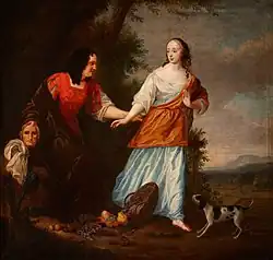 Elizabeth’s mother was staying at the court of Elizabeth Stuart, Queen of Bohemia at the Hague. During one of her stays with her mother in 1656/7, Louise, Princess Palatine, the Queen’s daughter, painted her in the character of the nymph Pomona and another portrait, which was given to Mary Evelyn at her request.[5][6]