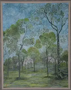 The San Francisco Chronicle's late art critic Alfred Frankenstein reviewed her showing at the Pomeroy Gallery in 1968, and said Charleston had a "wonderful eye" for flowers -- "totally charming, decorative and delectable."[2] Most of her works were impressionist oil paintings of flowers and the French countryside. Her works are available widely today, and have been shown in numerous museums and galleries in the US, Brussels, and Paris,[2][4] including Hammer Galleries in NY (at least four one-woman exhibitions at Armand Hammer's famed galleries),[5][6] Frank H. Boos Gallery in Bloomfield MI,[7] Conacher Galleries in San Francisco,[8] Salon des Femmes Peintres in Paris in 1974,[5][9] the Salon exhibition at Société des Artistes Français[9] in 1973,[5] the US Embassy in Brussels,[5] and at the Nationale des Beaux Arts Exposition du Tricentenaire[10] in 1973.[5]