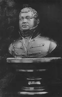 Because of her rank and connection to the past, Kekaʻaniau participated in many civic ceremonies during her later life. On June 28, 1909, Kekaʻaniau officiated and unveiled the tablet of the 1795 Battle of Nuʻuanu, which was installed at the Pali lookout by the organization Daughters of Hawaii.[46] On March 17, 1912, she officiated with Queen Liliʻuokalani when they both unveiled the Cooke Memorial Tablet, dedicated to Amos Starr and Juiette Montague Cooke and the sixteen students of the Royal School, in the vestibule of Kawaiahaʻo Church. The ceremony marked the 100th anniversary of the birth of Mrs. Cooke.[47] On March 17, 1914, Kekaʻaniau officiated with Liliʻuokalani at the unveiling of the tablet for the 100th commemoration birthday of King Kamehameha III. During the ceremony, Queen Liliʻuokalani represented the Kalakaua Dynasty, and Kekaʻaniau represented the Kamehameha Dynasty, seated on opposite sides of the memorial stone in the nave of the church. The palace chairs in which they sat were draped with ancient Hawaiian feather capes. The Queen drew the cord releasing her Royal Standard or personal flag, while Kekaʻaniau released the Hawaiian flag covering the tablet.[48][49] In 1897, Kekaʻaniau donated to the Bishop Museum the bust figure of Kamehameha II that was given by the British monarch, King George IV, when Kamehameha II died while on his state visit in London with his queen Kamāmalu in 1825. The British crown bought the lavish coffins and made the bust according to the English royal traditions during funeral services.[50] She also donated to the Bishop Museum the following items: 2 pictures, 6 feather leis, 15 kāhili's, 5 kāhili handles, 13 ʻumeke, 5 coconut bowls and 1 Niʻihau mat.[51] In 1996, two of her kahili's were featured in the museum exhibit in "The Legacy of Excellence, Highlights of Hawaiian Culture" and was described as being "the only ones of their kind".[52]