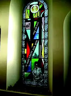 On 22 April 1998 the Macduff Parish Church dedicated a stained glass window to Mantell. This memorial, designed by Jennifer-Jane Bayless, consists of three windows and the focal point of Mantell holding a baby.[21] Also on the memorial are images of Macduff Parish Church and Mulanje Mission Hospital, as well as the Saltire Cross and Malawi flag.[22] The windows fuse new Celtic and African art.[22] It includes the quote, "My grace is sufficient for you" from 2 Corinthians 12:9 of the New Testament,[23] representing Mantell's method of practicing missionary work and providing inspiration to the title of her biography by David Randall, Grace Sufficient.[24]