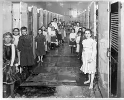 Anderson's recorded public health benefactions began with her initial gift in 1891 to Dr. Edward Livingston Trudeau's sanatorium for the tubercular at Saranac Lake, New York, where from 1893 until her death she underwrote the operating costs of his laboratory for the investigation of the treatment of tuberculosis.[4] Anderson's later gifts to improve public health included provision in New York City of a model public bath (1904);[5] the establishment through the Children's Aid Society of the Chappaqua, New York Home for Convalescent Children (1909);[6] the operating funds, with Mrs. William K. Vanderbilt, for the Home Hospital for the Tubercular (1912);[7] and in 1913 the establishment of the Department of Social Welfare at the Association for Improving the Condition of the Poor (a predecessor of today's Community Service Society of New York).[8] The latter department funded public school lunches in New York City for 25,000 school children, provided funding for increased school-based medical inspections, and supported installation of school drinking water fountains and improved ventilation. It also provided public "comfort stations" (bathrooms), public laundries, and in a tenement section of the city, a Food Supply Store which sold good quality food at cost. The department also performed the groundwork which led to the establishment and funding of community health centers, including the Mulberry Street, Columbus Hill and Judson Health Centers, all in New York City (1918–1921).[9] In 1916 Anderson gave $100,000 to Lillian Wald's Henry Street Settlement and joined its board of directors,[10] and separately became the lead donor to the city's Department of Public Charities' Children's Home Bureau, which outplaced orphans from institutions to families.[11] From 1914–1920, Anderson was the largest donor to Clifford Beers's National Committee for Mental Hygiene (today's Mental Health America) where she was particularly concerned for the treatment of returning World War I veterans with "shell-shock."[12]