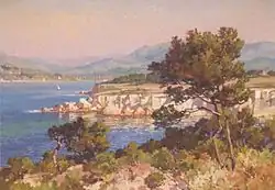 She had a fast, expressive style like John Singer Sargent[1] and was known for her seascape and landscape paintings. Her works have been sold for more than $44,000.[6] Roberts exhibited her works in the United States and in Paris.[1] She was discouraged, though, that her work was not accepted for exhibition in major galleries, few of her paintings sold, and she was not accepted as a member of Boston's Copley Society.[1]