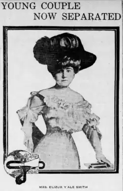 Despite being from wealthy families, the couple were not given large sums of money after their marriage.[31] Elizur's father, Wellington Smith, was an old-fashioned New Englander who thought that sons should first make their own way in life before having a share in the family wealth.[31] As a result, Mrs. Best filed for divorce 6 months later, and Smith fled to Europe.[40] Smith would inherit equally with his brothers a few years later when his father died in 1910.[41][31][17]