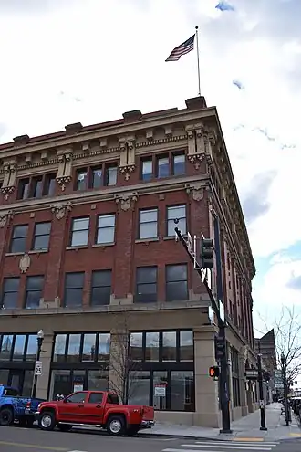 The exterior was described by the Sunday Capital News as "...a modern adaptation of the Renaissance. The first story is treated with a modern store front over which is a wide frieze and sill courses of stone. The second and third stories are divided into large panels by wide pilasters of brick with stone caps and bases. over these pilasters forming the sills of the fourth story windows is a heavy moulded band of stone. The top of the building is finished with a wide overhanging cornice in the Renaissance style, supported by large brackets and modillions. The parapet wall of the building above the cornice consists of heavy brick piers with panels of brick and wrought iron balustrades between. The two street elevations are faced with dark red pressed brick and light gray Boise sandstone."[3]
