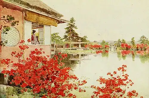 With success came opportunities for travel. A 1902 exhibition of water color drawings of the West Indies[6] was followed in 1904 by a show of pictures of Japan.[7] In 1905 Du Cane was hired by A & C Black to provide illustrations for The Italian Lakes (1905), with descriptions by Richard Bagot.[8] The company also used several of her Japan pictures in a book by John Finnemore.[9] Building on her success, Du Cane arranged with Black to do a book on Japanese gardens with text written by her sister, Florence, a book released in 1908 as The Flowers and Gardens of Japan.[10] The following year, the sisters' second book, The Flowers and Gardens of Madeira appeared.[11]