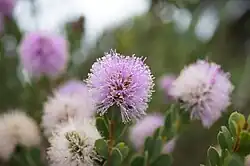 Influenced by the American picturesque park movement, Scripps Memorial Park has a 3.8-acre lawn and heritage plantings that include groves of gnarly trunked pink melaleuca (Melaleuca nesophila), an Australian native plant; exotic dragon trees (Dracaena draco) from the Canary Islands; several Monterey cypress (Hesperocyparis macrocarpa); and a row of Mexican fan palms (Washingtonia robusta).[1]