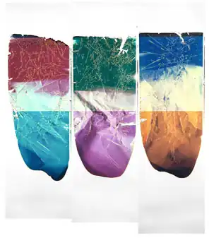 In 2000, she began producing brightly hued photograms whose series titles reflected the objects or materials she used to interrupt or strike the paper (e.g., "Push Pins", "Penlights") or referenced visual phenomena, such as afterimages ("Blinks").[54] Reviewers describe her color photograms as "hyper-saturated, jewel-toned abstraction"[41] suggesting light candies, paper diamonds or asymmetrical kaleidoscopes, in which color is the subject itself;[55][56] they compare their fluid soaks of color to the stain painting of Helen Frankenthaler and Morris Louis and the painterly, draped fabric of Frans Hals and John Singer Sargent.[1][51] Considering them conceptually, Leah Ollman wrote, "Throughout this body of work, the paper's surface does double duty as object and subject, material and image. The literal and the abstract merge."[1]