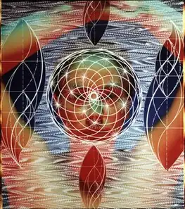 In 1984, she turned to brilliantly hued, multiple-exposure color images, made with one of only five existing Polaroid 20 × 24 cameras, which were cooler, androgynous, and more aesthetically seductive.[29][4][48] This work departed from traditional portraiture in no longer seeking to capture the character or identity of its subjects;[4][48] rather, Carey or others served as de-individualized stand-ins for the human spirit, seamlessly disappearing into and merging with Op Art and Pop patterns evoking technology, biology, consciousness, time, and perhaps artificial intelligence.[47][33][49][44] Critics such as Barry Schwabsky suggested that the specific qualities of the patterns opened interpretive possibilities and raised notions of the self, variously, as infinitely complex, unknowable, fractured, constructed from readymade cultural forms, or spiritually seeking.[48][29]