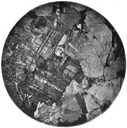 The 1898 account of Edward B. Mathews of the Maryland Geological Survey[5] of the quarries at Ellicott City begins with a statement that there were two quarries; one on either side of the Patapsco River. The rock on the eastern, or Baltimore County, side is "a fine grained mass, with a decided foliation or gneissic structure," while the rock on the western, or Howard County side, is "more uniform and granitic." The text also refers to the figure of the polished slab on the right: "Here it also has a porphyritic structure in consequence of the development of large flesh-colored crystals of feldspar which are disseminated somewhat irregularly through the rock, as shown in (the figure)." Mathews continued with a description of their historical importance:
