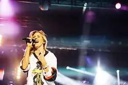Goulding's debut album Lights (2010) experimented with genres including indie pop, synthpop, folktronica and indietronica. The album contained "sparkling pop with a folky heart and an electronic edge" and was noted as being infectious.[211] The album incorporated "acoustic guitar" and "retro-synthpop" compared to that of Little Boots and La Roux, while the production contained "folkie origins under a welter of busily cycling synths and programmed beats".[212] Goulding's second album Halcyon (2012) followed in the same vein, including genres such as indie pop, synthpop and dream pop. She stepped away from the electronic sound of her previous album and moved to a more tribal and anthemic sound containing a bit more piano and vocal.[213] Its re-issue Halcyon Days (2013), which features ten new songs, marked Goulding's return to electropop. Goulding spoke in an interview with Elle about the reason behind her return to a more electronic sound, stating: "I have such an affinity with electronic music that I can't step away from it."[214] Goulding's third studio album Delirium (2015) was a pivotal moment for the songstress' career, as it presented a change in the musical direction for Goulding, reaching for a more maximalist pop oriented sound.[215] The album divided music critics and fans alike, with critics praising the album production, but expressing scepticism on the lack of personality in the lyrical content, as in contrast from her previous two records.[216][217] Rooted in Pop music, Delirium experimented with genres such as electropop, synthpop, dance, R&B, and folk-pop.[218] Goulding's fourth studio album Brightest Blue (2020) is divided in two sides; the first side has been compared to her early releases as it recaptures the "simplicity" and "vulnerability" of her first two records. Sonically, experiments with genres such as R&B, soul and electropop.[219] Meanwhile, the second side EG.0, incorporates influences from music genres like Hip-Hop and dance.[220] Goulding's fifth studio album Higher Than Heaven (2023) is mainly a dance-pop and nu-disco record, it also incorporate tracks with synthpop, R&B and EDM influences.[221][222]