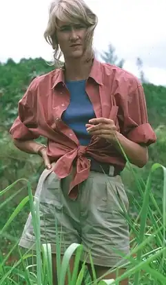 In the first film, Sattler's primary outfit consists of khaki shorts and an open, pink-colored button shirt, tied at its bottom above the waist and worn over a blue tank top.[77][78] Kyle Munzenrieder of W called the outfit "decidedly feminine without overtly catering to the male gaze", further writing: "It’s casual, yet conveys a sense of authority and intellect. In a way, the outfit helps communicate that Dern’s character is every bit the scientific and survival equal as the men".[78]