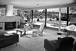 The one-story home was known for its light-filled openness, featuring many sliding glass doors that provided views and passage into the garden. Similar to Ellwood's, Lappin House, the home was designed and arranged with a spine corridor, and featured a free-standing centrally located brick fireplace that separated the living room area from the dining room, similar to Case Study House 9 designed by Charles Eames and Eero Saarinen.[10][1] Progressive Architecture magazine published a feature story on the home, and was considered a "showpiece" that was featured in other architectural magazines as well.[3]