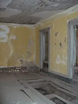 The interior of Elm Bluff is divided by a spacious center hall on all levels, usually with two rooms to each side. The brick interior walls are plastered. A series of wide staircases in the central halls of each level wind up to the third floor. Like the exterior, the interior originally demonstrated a high level of finish. Many of the architectural elements were taken from pattern books, such as those by Minard Lafever and Asher Benjamin. Most of the wooden details, such as base boards, stair banisters, and door facings, have now been removed or vandalized. Details that have survived intact are the Greek Revival casings that survive on some of the window and door openings on the upper floors and finely contoured plasterwork crown moldings.[2]
