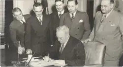From the time he returned to California from Massachusetts in 1923, Belt advocated for the establishment of a medical school at UCLA.[14][15] Despite his rising status and influence, Belt's efforts were hindered by the economic and political upheavals of the Great Depression and World War II. However, in 1945, after the war, he launched a lobbying campaign with the State Legislature's Appropriations Committee. As Governor Earl Warren’s personal physician, Belt seized the opportunity during a consultation to passionately advocate for the establishment of a medical school under UCLA’s administration.[16] Before leaving Belt's office, Warren pulled out a notebook and outlined a ten-step plan to move the project forward and secure approval from the state legislature. For the final step, he wrote, "Be there to stand behind me when I sign this legislation."[17] On February 19, 1946, Belt stood alongside other dignitaries as Governor Warren signed a bill allocating $7 million to establish a medical school at UCLA.[18]
