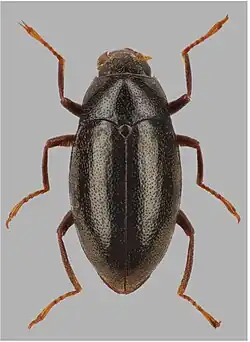 Adults reach a length of 2.63 mm (males) and 2.60–2.83 mm (females). Their body is oval, strongly convex, widest around the middle of the elytra and integument black. The mouthparts, antennae and legs are reddish brown.