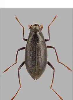 Adults reach a length of 3.04–3.18 mm (0.120–0.125 in) (males) and 3.27–3.47 mm (0.129–0.137 in) (females). Their body is oblong-ovate and dark brown to black, while the mouthparts, antennae and legs are reddish brown.[1]