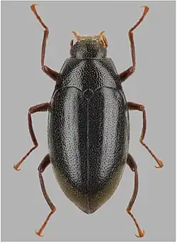 Adults reach a length of 2.59–2.97 mm (males) and 2.91–3.19 mm (females). Their body is narrowly oval, convex dorsally, widest before midlength of elytra and integument dark brown to black, while the mouthparts, antennae, trochanters, and tarsi are reddish brown.