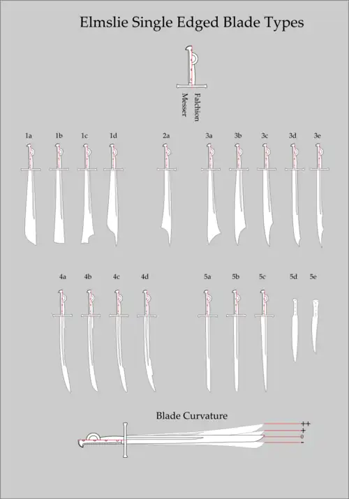 The Elmslie typology is a system for classification and description of the single edged European bladed weapons of the late medieval and early baroque period, from around 1100 to 1550. It is designed to provide classification terminology for archaeological finds of single-edged arms, as well as visual depictions in art. It includes swords which are from the Europeans Middle Ages (approximately 11th through 16th centuries) and currently breaks them down into five main types, which each have several subtypes. Historian and bladesmith James Elmslie introduced the typology 2015,[1][2] as a complement to the Oakeshott typology which covers double edged swords of the same periods.
