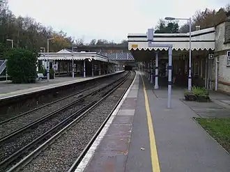 Elmstead Woods railway station is on the South Eastern Main Line, serving the district of Elmstead in the London Borough of Bromley. It is 10 miles 21 chains (16.5 km) down the line from Charing Cross and is situated between Grove Park and Chislehurst stations.
