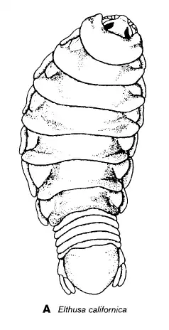 E. californica has maxillipeds composed of two articles, while the mandible has palps made up by three articles. The thorax is typical for Elthusa spp. It is made up of eight segments, where the first segment with the head embedded into it, is the largest, with an approximate size of 2 mm in length. Both second and third segments are equal in length around 1.5 mm. The fourth, fifth, and sixth segments are all 1 mm in length. The seventh segment is then the shortest one with a length of 0.5 mm. Narrow plates called epimerae are separated along the last segments on the thorax. In the last segments, the epimera is capable of fully extending across the segment. The terminal thorax is at the posterior and it is about 4 mm wide and 3.5 mm long.[7]