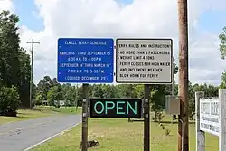 For two months in the summer of 2009, the ferry service remained closed, while pavement erosion from the Cape Fear River at the north and southern ferry landings was repaired. Service resumed in August, 2009.[6] Following Hurricanes Matthew and Florence in 2016 and 2018, the ferry was closed for a year. In January 2020, flooding caused major damage and the ferry was taken to the Department of Transportation in White Lake, Bladen County for repairs. Today it is back on the water between Kelly and Carvers Creek, resuming operation on October 10, 2022.