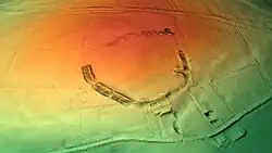 The hill fort is oval and 2.9 hectares in area.[8] It was enclosed in the 1830s and laid to pasture and last ploughed around 1943.[9] A polished stone axe was found at the site.[10]
