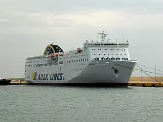 Elyros is a Greek ferry, which is the second newest ship, being part of ANEK Lines fleet, following Asterion II. She is a motor Ro-Ro/Passenger ferryboat, built in 1998 at Mitsubishi Heavy Industries shipyard at Shimonoseki, Japan, and put into service by ANEK at 2008 (previously operated under different names and owners). It holds a total of 1,874 passengers and 620 vehicles,[2] She has 323 passenger air type seats. She has two Pielstick 12PC4-2 engines,[3] with combined power of 26,180 kW and reaches speeds of up to 24 knots. It also has an internet cafe. The ship has been awarded by ShipPax Awards 2009[4] as the ship with the best retrofit for 2008. It was named after Elyros; an ancient city of southwestern Crete.