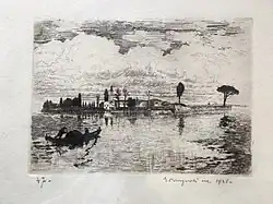 Brugnoli moved to Venice in 1880 and began teaching at the Accademia of Venice in 1912, teaching etching. Art historians see Brugnoli's graphical works in the context of the European etching revival in the last quarter of the 19th century. Alessia del Bianco, in a summary of her thesis on Brugnoli (Emanuele Brugnoli e la Scuola di Incisione veneziana),[3] points at the "process of reaffirmation of etching as an autonomous and original language in Venice between the end of the nineteenth century and the early twentieth century."[4] In 2011, Mauroner and Brugnoli were featured in an exhibition (The Heirs of Canaletto: Fabio Mauroner and Emanuele Brugnoli in Venice, 1905-1940) at the Italian Embassy in Washington D.C., which took place at the same time that an exhibit titled Canaletto and his rivals was being held at the National Gallery in the same city.[5]